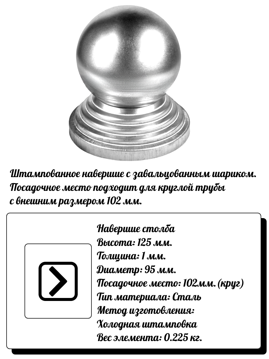 Штампованное навершие с завальцованным шариком. Посадочное место подходит для круглой трубы с внешним размером 102 мм.